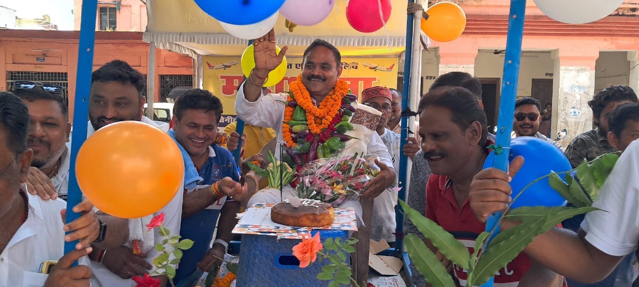 टाटा महाराज का जन्मदिन मनाने उनके समर्थक कुछ अलग ही तैयारी कर रखे थे। वह रेहड़ी ठेला में चारों तरफ गुब्बारे और फूल फल से सजावट किया। इसके बाद टेबल में घर का बनाया हुआ केक रखे हुए थे और एक कुर्सी भी रखे थे। टाटा महाराज जैसे अपने घर से राघवेंद्र राव सभा भवन पहुंचे समर्थक उन्हें बधाई देते रहे, लेकिन उनकी तैयारी को देखकर टाटा महाराज आश्चर्यचकित हो गए और वो भी समर्थकों के इस तरह की उत्साह और प्यार को देखते हुए ठेले में बैठने के लिए मना नहीं कर सके और ठेले में बैठ गए। इसी के साथ ही टाटा महाराज को उनके समर्थक बड़े नेताओं की तरह लोगों का हाथ उठाकर अभिवादन करने का आग्रह किया और टाटा महाराज समर्थकों के कहे अनुसार हाथ उठाकर अभिवादन करते रहे, इस दौरान समर्थक नारा लगाते रहे, “देश का नेता कैसा हो टाटा महाराज के जैसा हो” केक काटने के बाद सभी समर्थक आपस में मिलकर केक खाए और उनके जन्मदिन को अनोखा बना दिया।