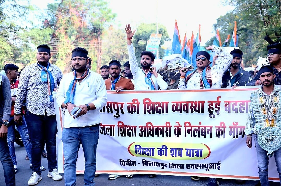 बिलासपुर सोमवार को एनएसयूआई जिलाध्यक्ष रंजीत सिंह के नेतृत्व में बिलासपुर जिला शिक्षा अधिकारी टीआर साहू के निलंबन की मांग को लेकर शिक्षा व्यवस्था की शव यात्रा निकालकर कलेक्टोरेट घेराव कर राज्यपाल के नाम ज्ञापन सौंपा गया।