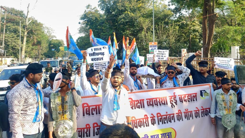 बिलासपुर एनएसयूआई जिलाध्यक्ष रंजीत सिंह ने बताया कि बिलासपुर में अनेकों ऐसे विद्यालय हैं जहां विद्यार्थियों से फीस के नाम पर मोटी रकम तो वसूल की जा रही है, परंतु छात्रों को न तो गुणवत्तापूर्ण शिक्षा दी जा रही है और न ही बुनियादी सुविधाएं उपलब्ध कराई जा रही। बिलासपुर के गली मुहल्ले में बिना मान्यता के अवैध रूप से स्कूल संचालित किए जा रहे हैं। बिलासपुर का शिक्षा का स्तर दिन प्रतिदिन नीचे गिरते जा रहा है,साथ ही बिलासपुर जिले में संचालित श्री चैतन्य टेक्नो स्कूल जो बिना सीबीएसई मान्यता के पाठ्यक्रम, मूल्यांकन तथा परीक्षा का आयोजन सीबीएसई के आधार पर कर रहा है, महर्षि यूनिवर्सिटी तथा महर्षि शिक्षा संस्थान में डीएलएड पाठ्यक्रम का संचालन दो अलग अलग संस्था के नाम पर एक ही भूमि भवन तथा प्राध्यापकों के दस्तावेजों के आधार पर कूटरचित दस्तावेज प्रस्तुत कर भ्रामक तरीके से मान्यता लेकर अवैध रूप से डीएलएड पाठ्यक्रम संचालित किया जा रहा है। रंजीत सिंह ने बताया कि इसी महर्षि यूनिवर्सिटी के कुलपति जो अपने कूटरचित दस्तावेजों के आधार पर पदस्थ हैं जिस पर जांच और कड़ी कार्यवाही करने के लिए एनएसयूआई द्वारा कलेक्टर,पुलिस महानिरीक्षक,पुलिस अधीक्षक के साथ ही अनेकों शासकीय कार्यालयों में इस संबंध में अनेकों लिखित शिकायत ज्ञापन, धरना प्रदर्शन और आंदोलनों के माध्यम से कार्यवाही की मांग की जा चुकी है परंतु शासन प्रशासन के कान में जूं तक नहीं रेंगा है। जिलाध्यक्ष रंजीत सिंह ने भारतीय जनता पार्टी के एक साल पूरे होने पर छत्तीसगढ़ बदहाल होने का नारा देते हुए सत्ता पक्ष पर निशाना साधते हुए कहा कि बिलासपुर जिला शिक्षा अधिकारी जिन पर आय से अधिक संपत्ति का मामला दर्ज है डीईओ के कवर्धा तथा बिलासपुर निवास में दसों करोड़ों रुपए की संपत्ति बरामद की गई है,जो डीईओ द्वारा अवैध संस्थाओं से मिलीभगत कर रुपए लेकर कमाई गई राशि है उसके बावजूद भी प्रदेश की सरकार द्वारा इस विषय पर कोई भी जांच या कार्यवाही नहीं की जा रही है भ्रष्टाचारी जिल शिक्षा अधिकारी टी आर साहू अपने कुर्सी पर दीमक की तरह जमे हुए हैं।इतने शिकायतों और प्रदर्शन करने के बावजूद भी डीईओ टी आर साहू पर कार्यवाही नहीं होने का कारण जिलाध्यक्ष सिंह ने बताया कि जिला शिक्षा अधिकारी द्वारा प्रदेश सरकार के सर्वोच्च पदों पर पदस्थ प्रमुख नेता के साथ रिश्तेदारी होने का धौंस जमाया जाता है साथ ही डीईओ साहू का कहना है कि जब तक मैं स्वयं न चाहूं मुझे कोई भी नहीं हटा सकता है और संस्थाओं से लिए जाने वाले रुपए यहां से लेकर ऊपर तक पहुंचाया जाता है। रंजीत सिंह के नेतृत्व में सैकड़ों एनएसयूआई के कार्यकर्ताओं ने बिलासपुर जिला शिक्षा अधिकारी के द्वारा की गई बिलासपुर 