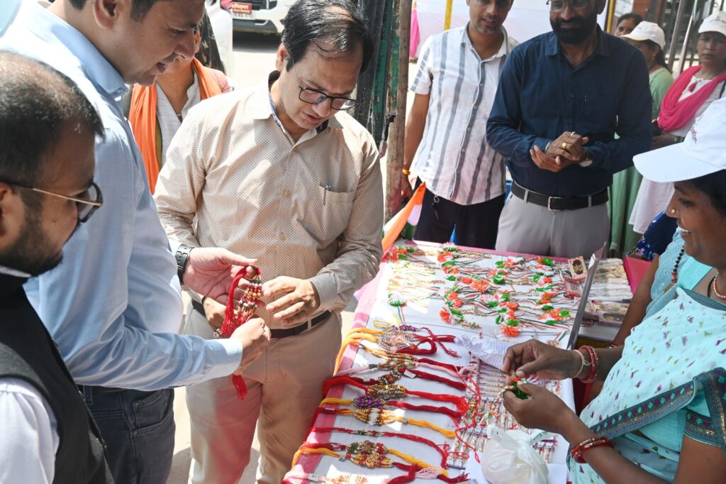 जिला पंचायत अध्यक्ष राजेश सूर्यवंशी और कलेक्टर संजय अग्रवाल ने चर्चा कर दीदियों का उत्साह बढ़ाया और कामकाज के विषय में जानकारी ली। जिला पंचायत अध्यक्ष श्री राजेश सूर्यवंशी और कलेक्टर संजय अग्रवाल ने दीदियों से तिरंगा, राखियां सहित अन्य पूजन सामग्री खरीदी। जिला पंचायत अध्यक्ष राजेश सूर्यवंशी और कलेक्टर अग्रवाल ने शहर वासियों से भी स्टॉल आकर स्व सहायता समूह द्वारा निर्मित उत्पादों की खरीदारी करने के साथ ही हर घर तिरंगा अभियान में भागीदारी की अपील की। श्री अग्रवाल ने कहा कि दीदियों के आजीविका संवर्धन की दिशा में यह प्रयास है। तीन दिन तक चलने वाले प्रदर्शनी सह विक्रय केंद्र में दीदियों द्वारा बनाए गए तिरंगा, राखियां, तिरंगा जैकेट, अगरबत्ती, पूजन व सजावटी सामग्री, आचार, पापड़ और अन्य घरेलू सामग्री उपलब्ध है। पहले दिन ही दीदियों ने अच्छा कारोबार करते हुए लगभग बीस हजार की बिक्री की, यह दुकानें आठ अगस्त तक चलेगी। इन स्टालों के माध्यम से दीदियां हर घर तिरंगा और हर घर स्वच्छता का संदेश भी दे रही हैं। इस अवसर पर निगम कमिश्नर अमित कुमार, जिला पंचायत सीईओ संदीप अग्रवाल,राष्ट्रीय ग्रामीण आजीविका मिशन जिला प्रबंधक रामेंद्र सिंह गुर्जर सहित विभिन्न विभागों के अधिकारी, कर्मचारी मौजूद रहे।